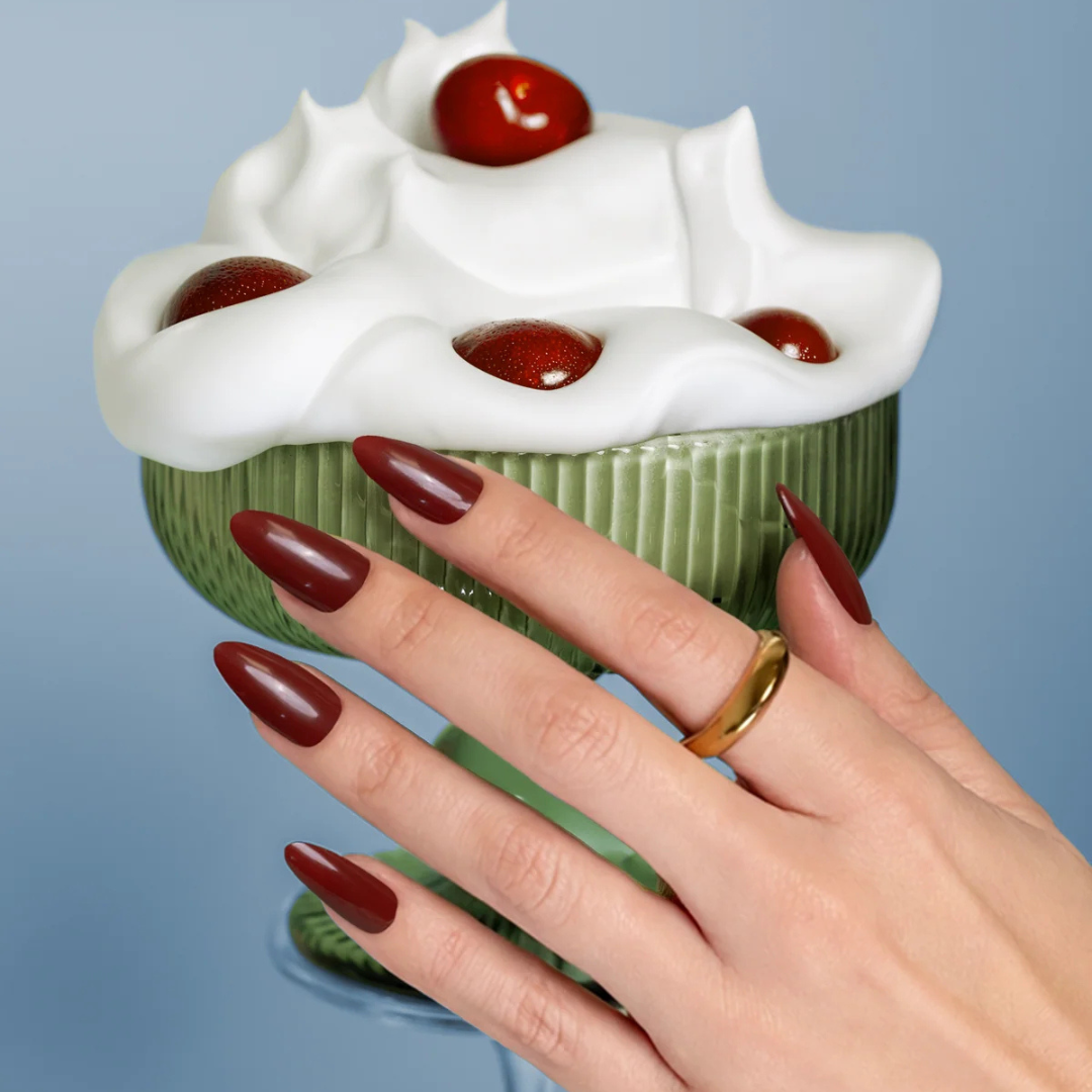 6. Aplicar uma camada de TOP COAT. Selar a ponta da unha. Catalisar durante 60 segundos em luz LED ou 120 segundos em luz UV*.
