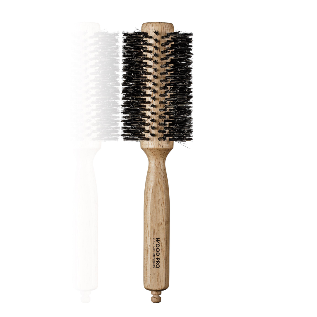 A escova de madeira com cerdas mistas javali/nylon 28mm é ideal para modelação, alisamento e acabamento profissional, sendo especialmente indicada para criar um brushing mais solto, com volume e movimento natural.