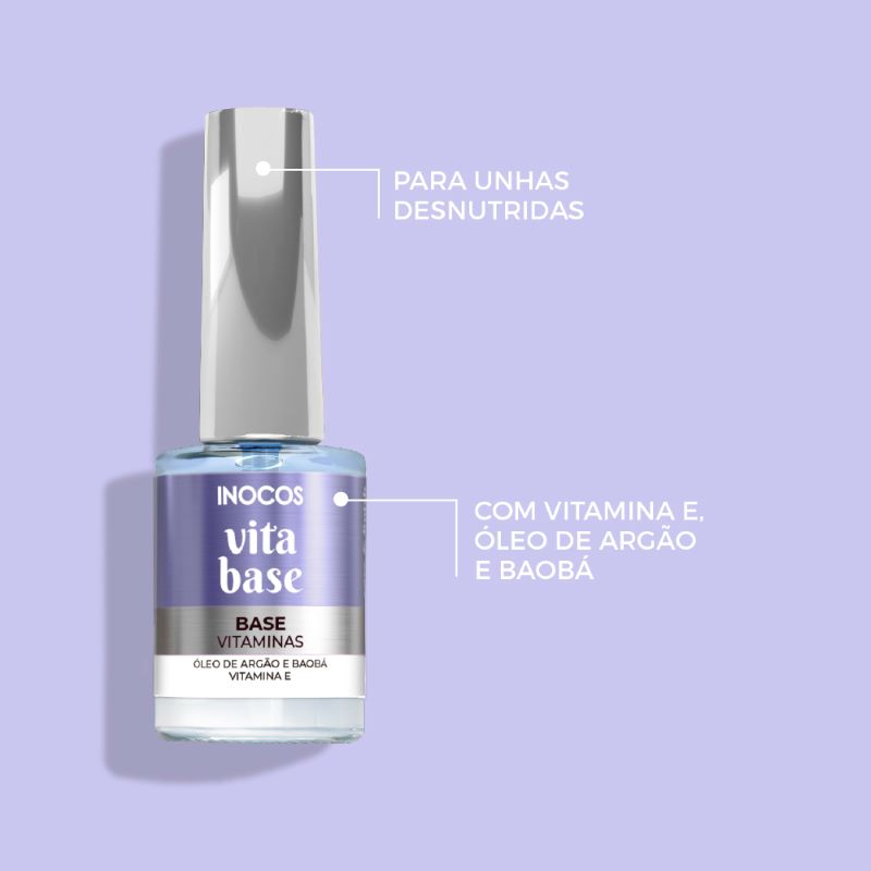 Base de verniz rica em vitamina E, óleo de argão e baobá para unhas desnutridas. Ideal para uso frequente com a Gama de Verniz Clássico e Like Gel INOCOS. Seca ao ar.